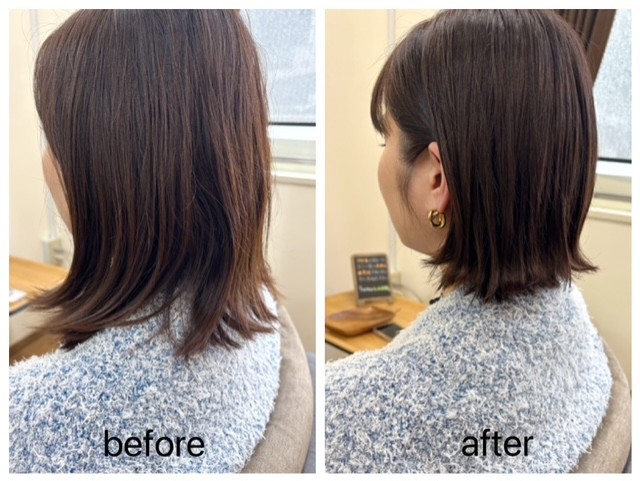 ・出来るだけ短めの顎ラインの外ハネボブがご希望のお客様です。髪質は比較的柔らかめですが量感が多いため、ボブのデザインにする場合は余分な膨らみをとる必要がありました。特に耳にかけたりすることを考慮しなければ、前から見た際にやぼったさが出てしまい、スタイリッシュ感が損なわれてしまうからです。毛流れとクセの影響で量感の溜まる左右差もありましたので、均等になるようにイメージしカットで質感調整を施しました。